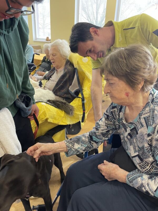 Ambasadorji nasmeha- terapevtski kužki so del našega stalnega programa aktivnosti. Radi jih imamo, ker s seboj prinesejo posebno energijo. Tudi danes ni bilo nič drugače. Obiskala nas je prisrčna mešanka Diva, ki se še pripravlja na to da bo postala samostojna terapevtka. S svojim vodnikom nam je pokazala kar nekaj trikov, ki so nas nasmejali in navdušili. Poleg tega pa nam je delala družbo tudi terapevtska mucka na baterije, ki je očarala tako goste kot tudi stanovalce, le Dive ni zmotila pri svojemu delu.