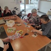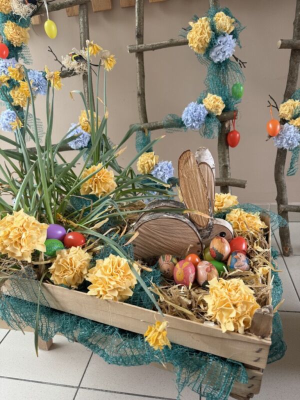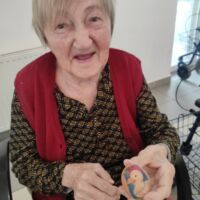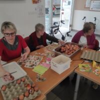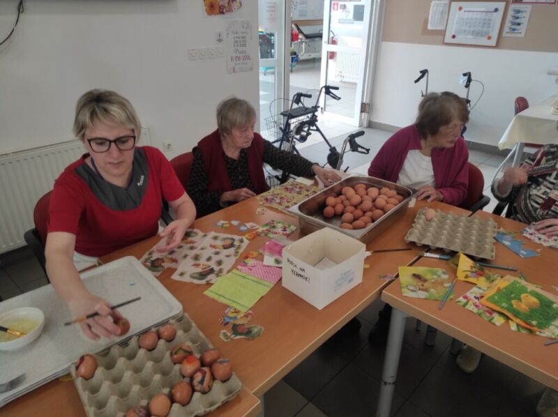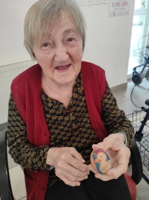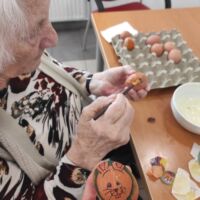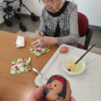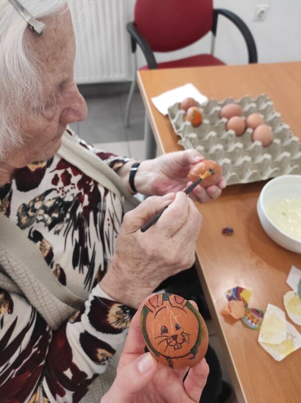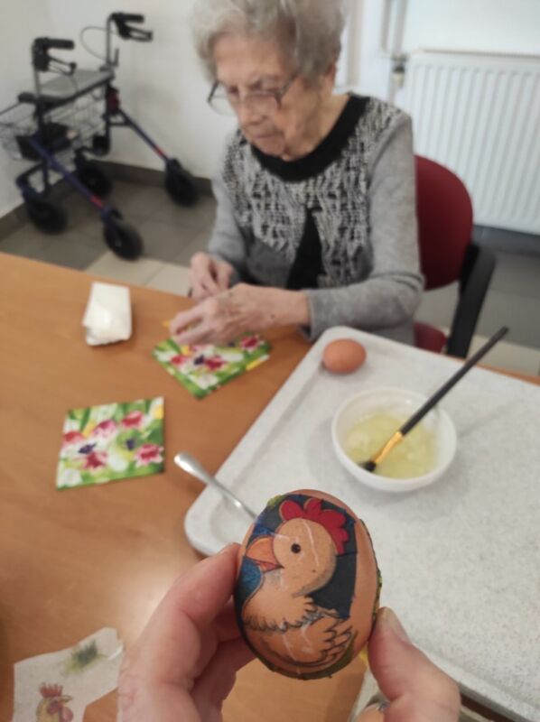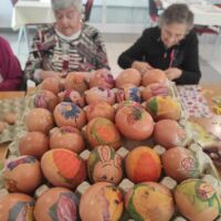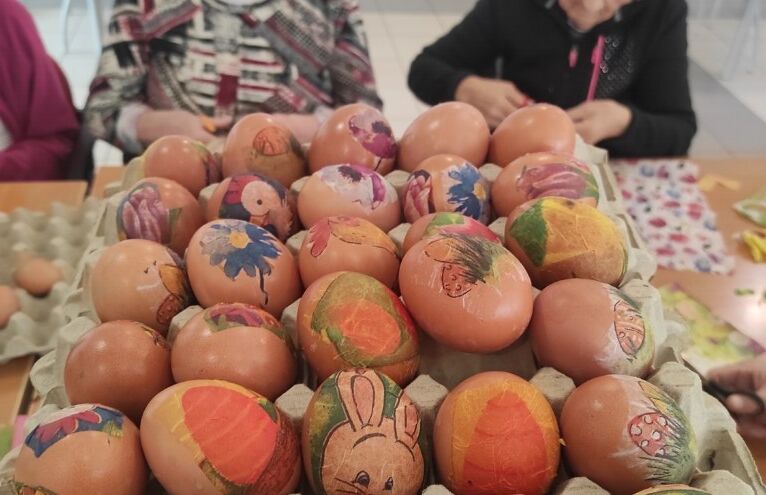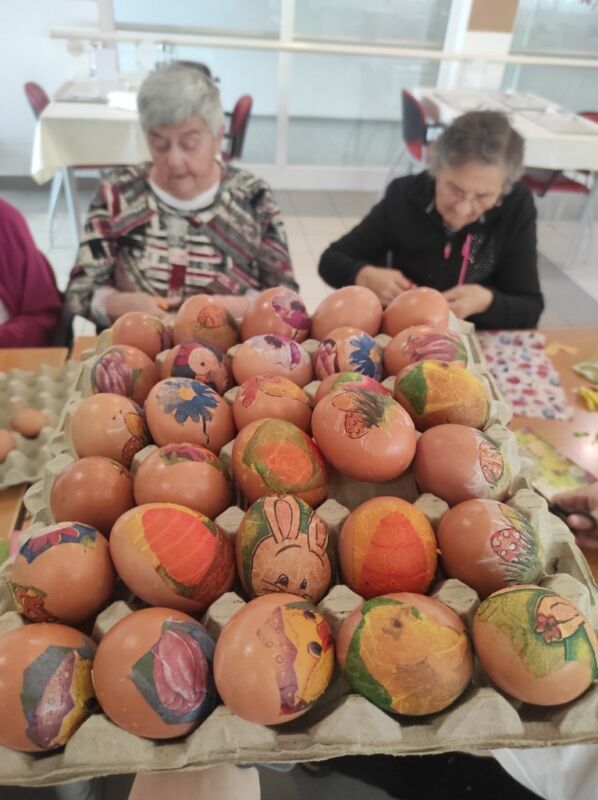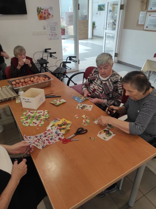 Prazniki se v letošnjem marcu vrstijo kot po tekočem traku… ravno smo praznovali dan žena in mučenikov, materinski dan in pozdrav pomladi, že so tu priprave na Veliko noč. Poleg duhovne priprave in priprave vseh jedi (potica, šunka, hren,…) v ta praznik spada nam zelo ljubo opravilo – barvanje velikonočnih jajc. Letos smo se lotili nekoliko modernejše tehnike, saj smo uporabili serveto tehniko, s katero so naše pisanke zares barvite, prisrčne in zanimive. Jajca tradicionalno sicer predstavljajo kaplje krvi, vendar smo se danes ob barvanji tako nasmejali razpoloženim gospem, da tokrat za nas predstavljajo tudi solze smeha.