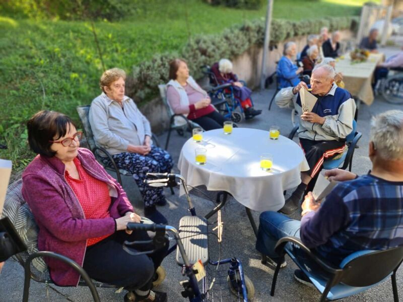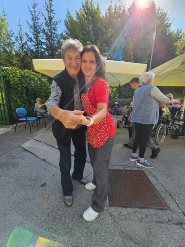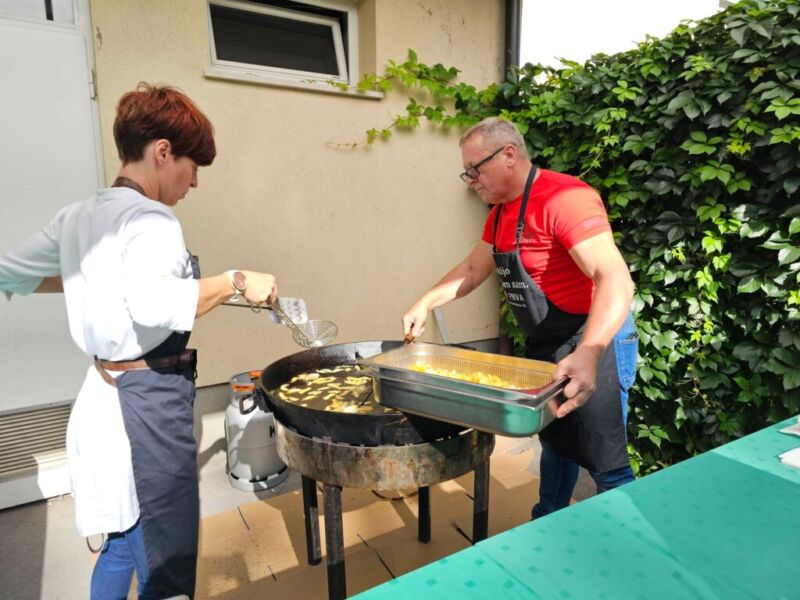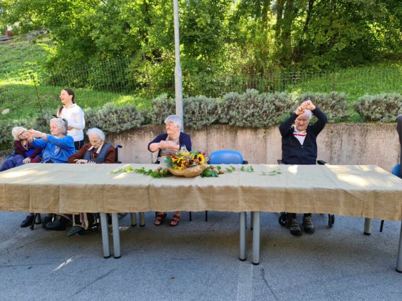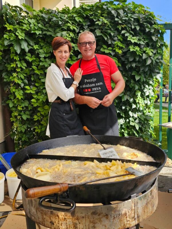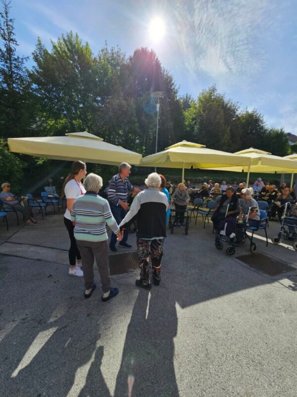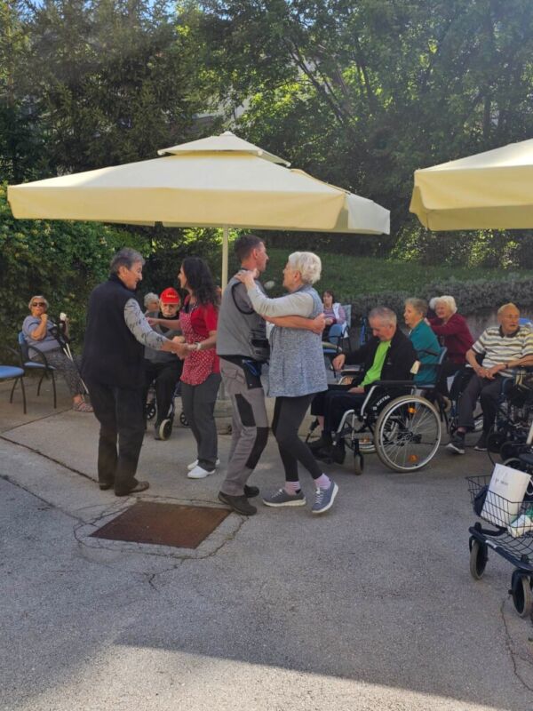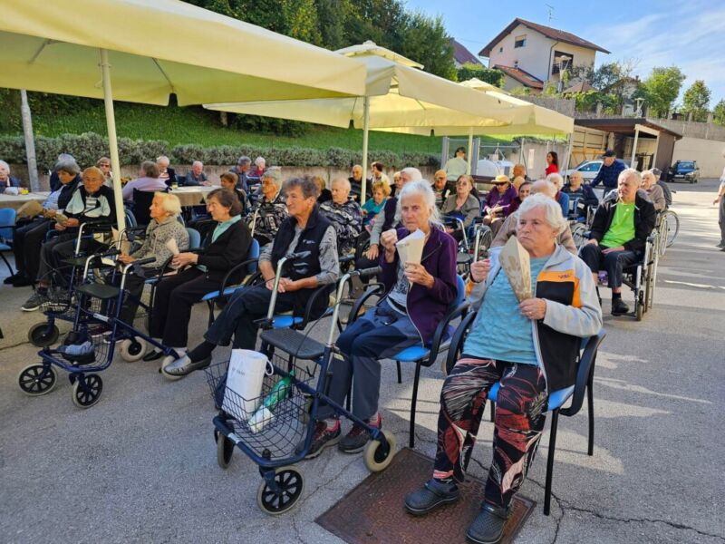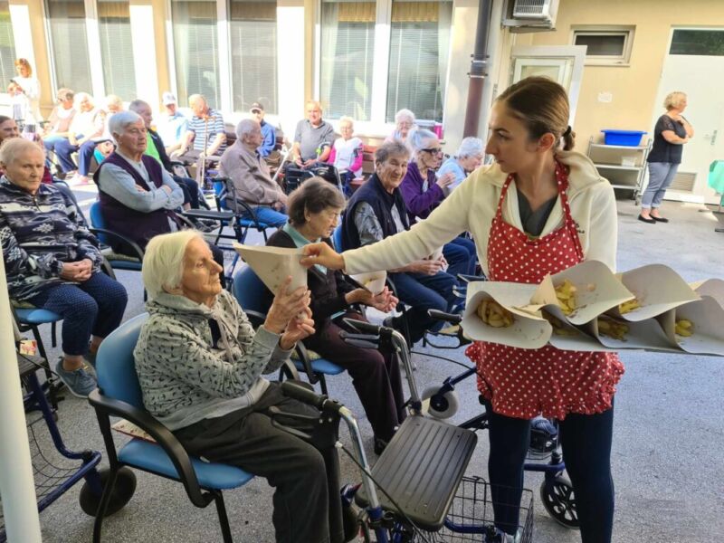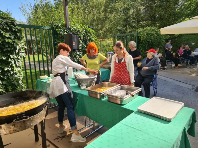 Danes je bil prekrasen dan, idealen za krompirjev piknik. Kmalu po 9 uri zjutraj, so se stanovalci in stanovalke DEOS, Centra starejših Cerknica začeli zbirati pred vrtom varovane enote, kjer so se najprej dobro raztegnili in potelovadili s fizioterapevtko Katjo. Že med telovadbo sta ekonom Janoš in računovodja Ines zavihala rokave ter pričela s peko krompirčka, da so se stanovalcem že cedile sline. Komaj so čakali, da se zaključi telovadba in da se piknik lahko prične. Stanovalke in stanovalci so povedali, da je bil krompir za prste obliznit. Da je bil resnično dober potrjuje tudi to, da ga ni prav nič ostalo. Druženje je bilo še bolj veselo, ko so skupaj ob poskočni glasbi tudi zaplesali.