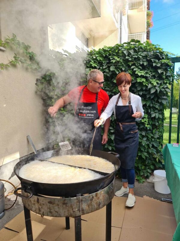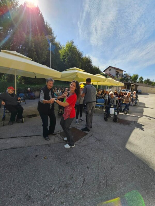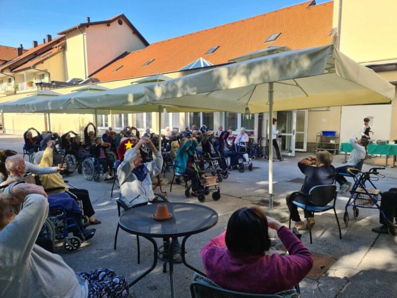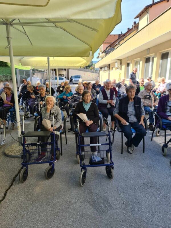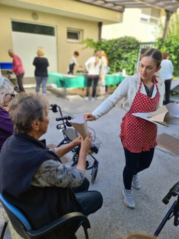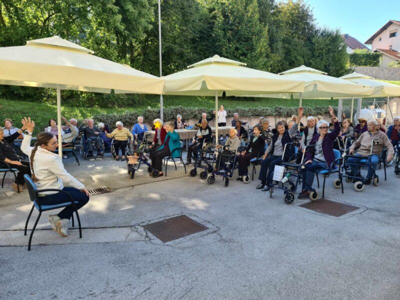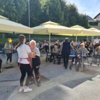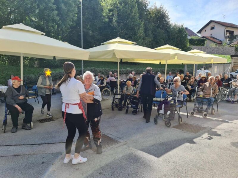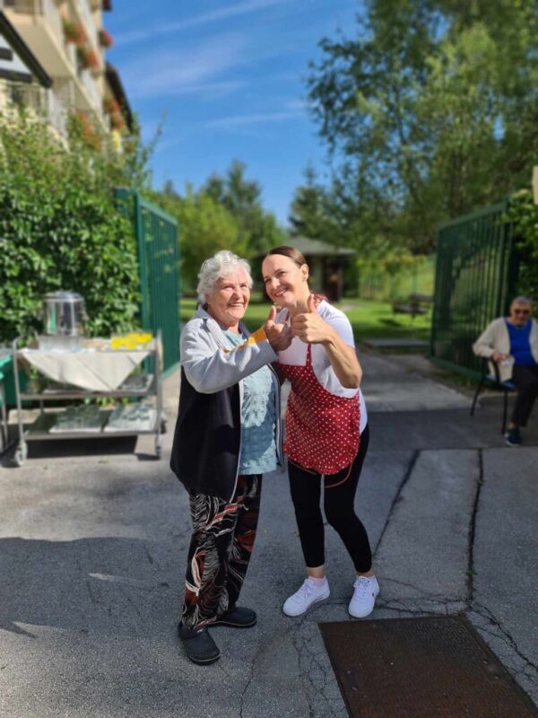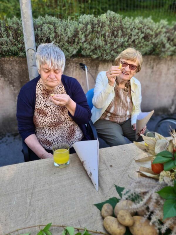 Danes je bil prekrasen dan, idealen za krompirjev piknik. Kmalu po 9 uri zjutraj, so se stanovalci in stanovalke DEOS, Centra starejših Cerknica začeli zbirati pred vrtom varovane enote, kjer so se najprej dobro raztegnili in potelovadili s fizioterapevtko Katjo. Že med telovadbo sta ekonom Janoš in računovodja Ines zavihala rokave ter pričela s peko krompirčka, da so se stanovalcem že cedile sline. Komaj so čakali, da se zaključi telovadba in da se piknik lahko prične. Stanovalke in stanovalci so povedali, da je bil krompir za prste obliznit. Da je bil resnično dober potrjuje tudi to, da ga ni prav nič ostalo. Druženje je bilo še bolj veselo, ko so skupaj ob poskočni glasbi tudi zaplesali.