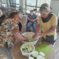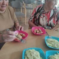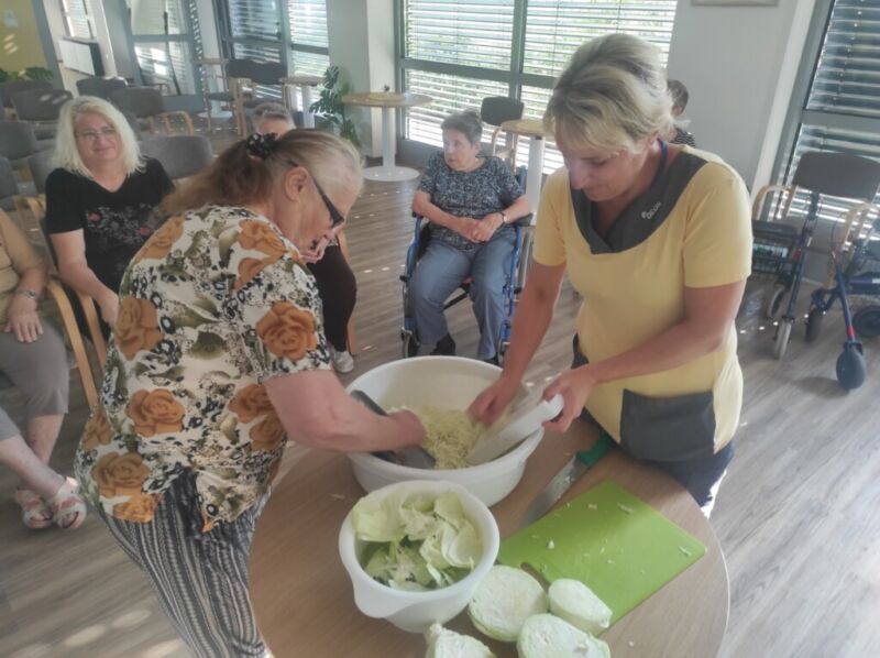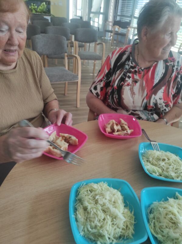 Pred kratkim smo skupaj s stanovalci izdelovali Zgornje savinjske žlinkrofe. Ker nismo pojedli vseh, smo jih nekaj zamrznili in zato smo lahko tokrat ponovno uživali v njih. Da pa je bilo vse skupaj še sočnejše, smo zraven pripravili tudi zeljno solato, ki je jed dvignila še na višji nivo; skoraj bi se že lahko kosali z dobitniki Michelinove zvezdice.