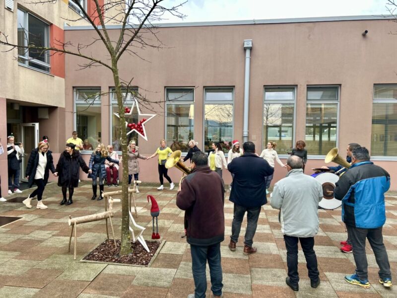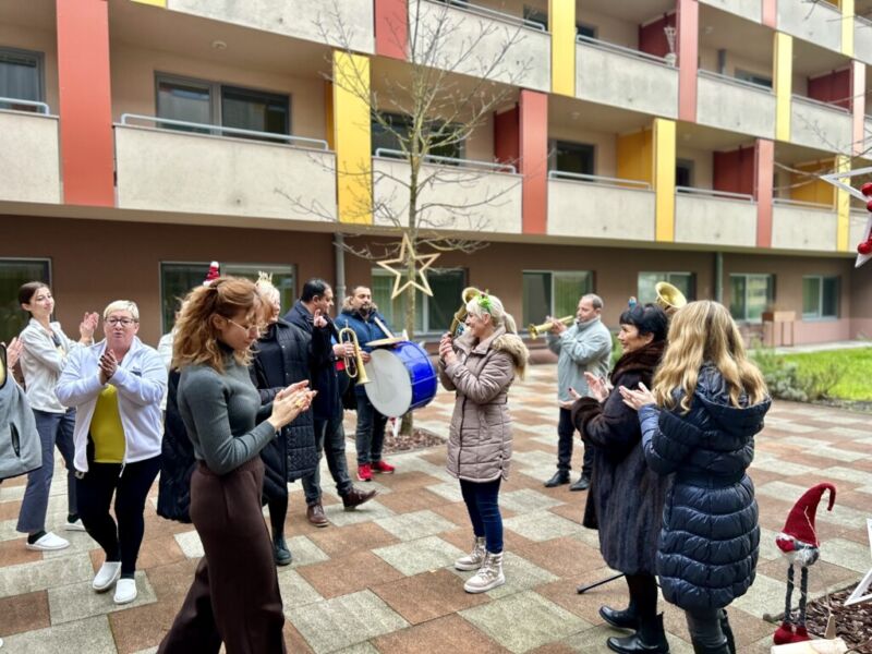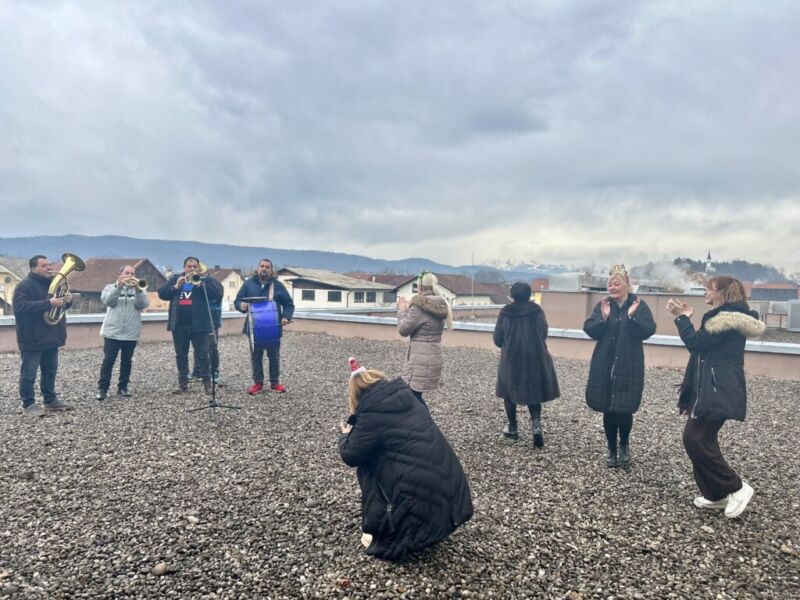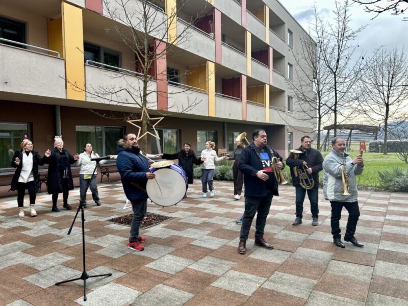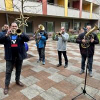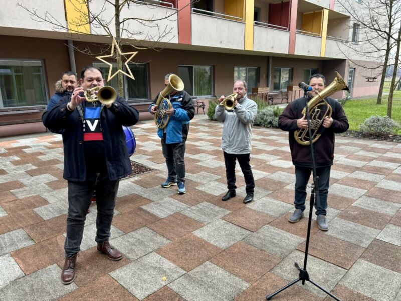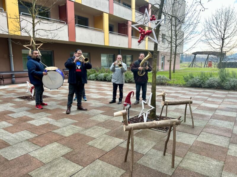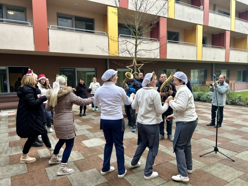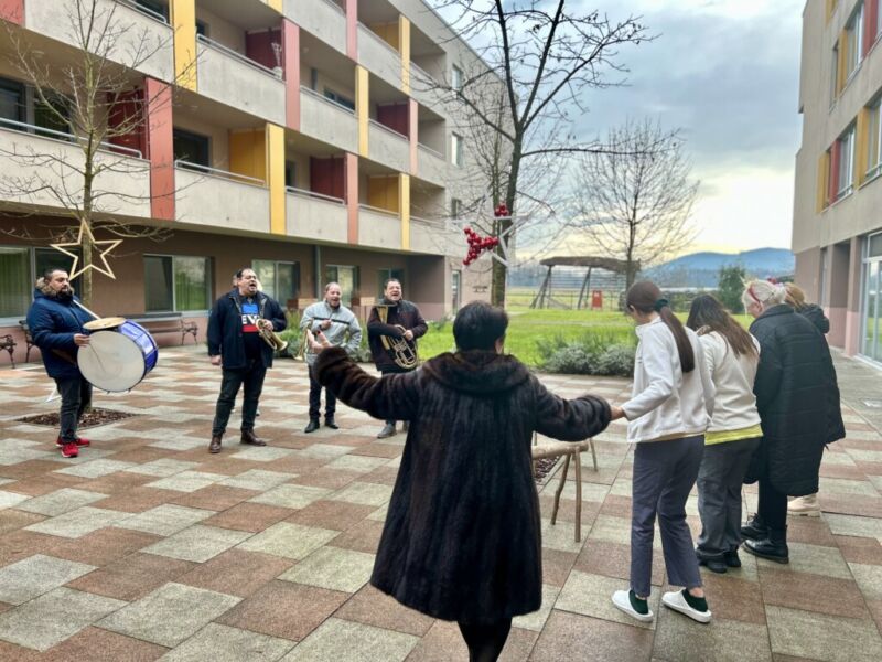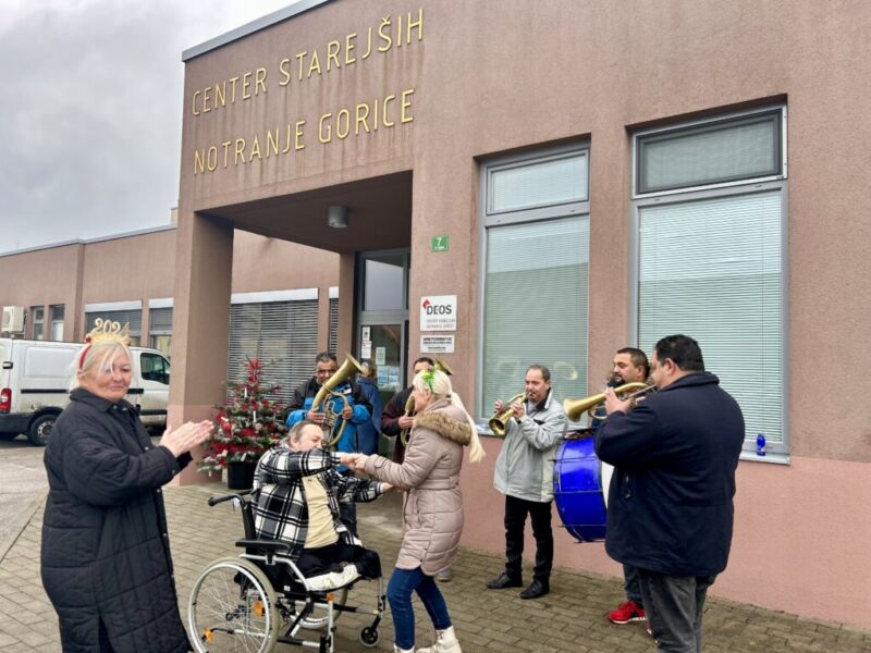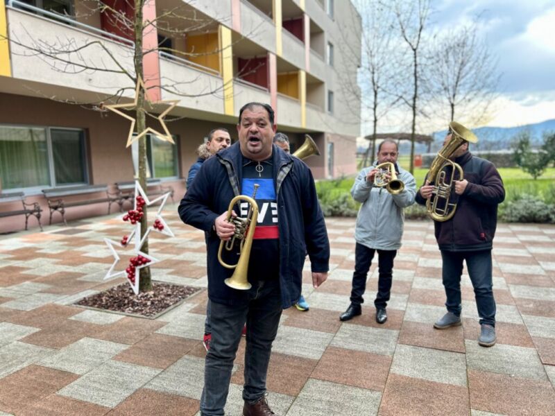 Na ogledu praznične Ljubljane se je direktorica dogovorila s trubači, da pridejo in razveselijo prav vse stanovalce centra. Glasba je odmevala po skupnosti in stanovalci ter zaposleni smo se veselili, ploskali, prepevali in celo zaplesali. Tudi streha centra je zopet oživela, glasba pa segla v vse kotičke, sobe, postelje, hodnike, delovne prostore in naravnost do srca. Muzičarji so bili gospodje iz Vranjega (Srbija). Z veseljem pridejo še igrati v Slovenijo in v Notranjih Goricah imajo kontakt, če koga zanima. Sami smo jih že rezervirali za naslednje leto in zagotovo bo zopet veselo.