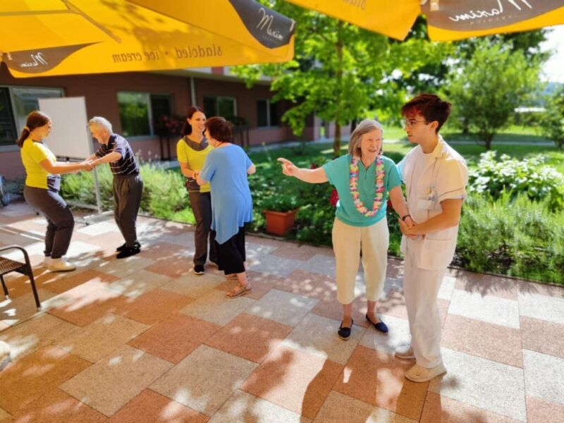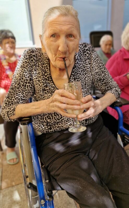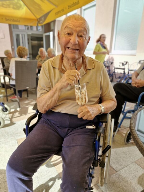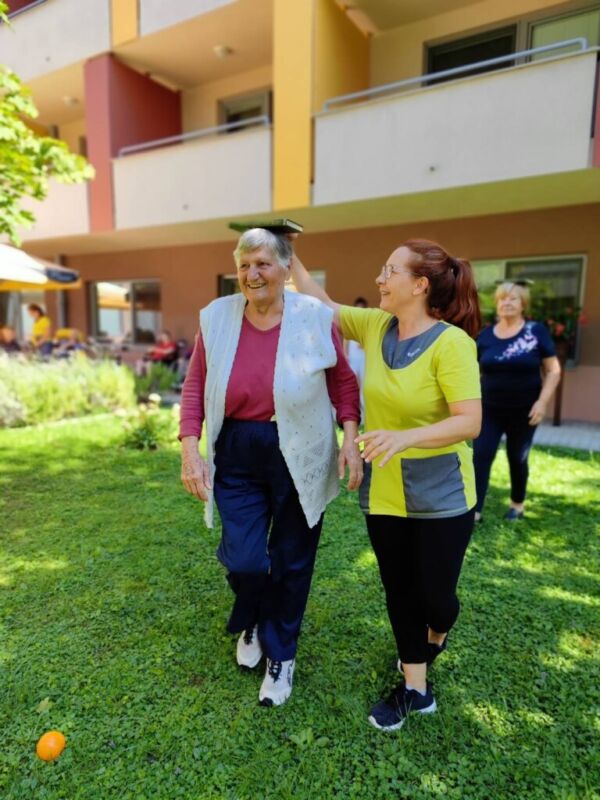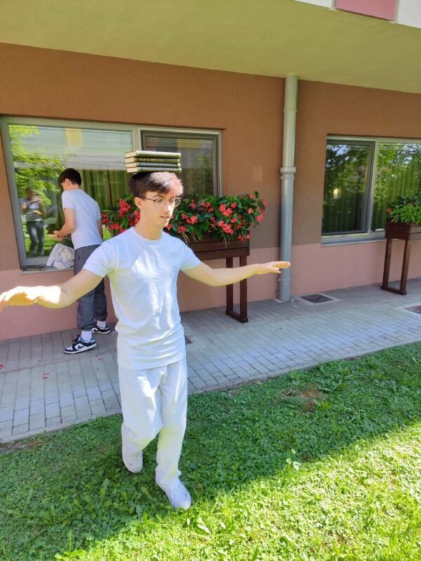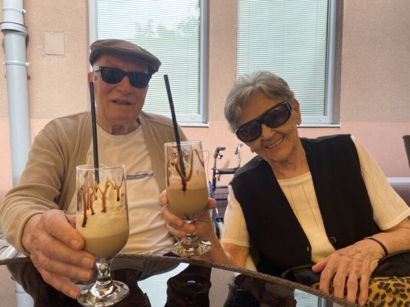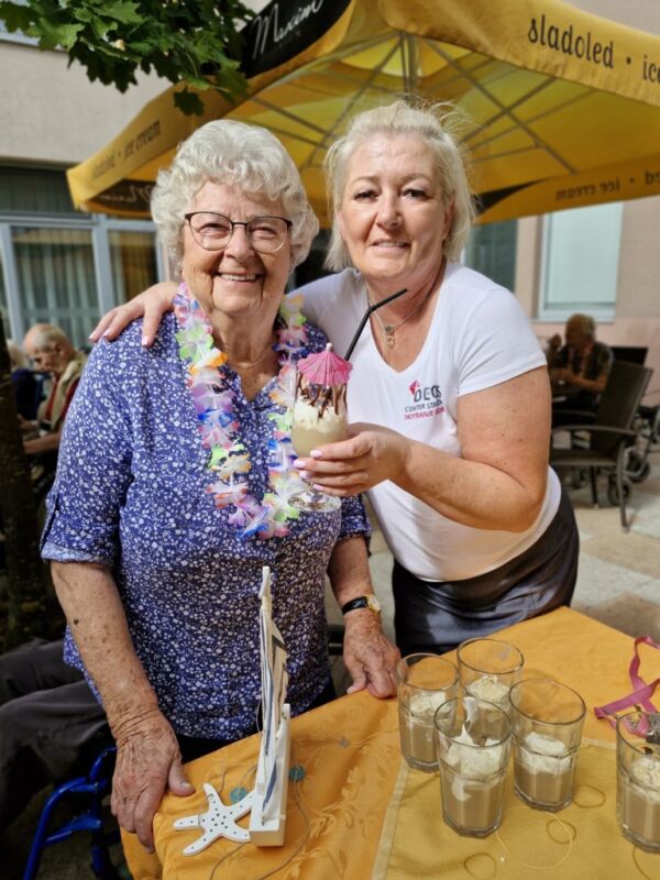 V poletnih mesecih se zelo radi nastavljamo soncu, hladimo v senci ali pod klimo, najraje pa se osvežimo s hladnimi pijačami in sladoledom. Našim stanovalcem in stanovalkam zato večkrat postrežemo limonado, sadne napitke (“smoothie”) ali sladoled. Danes pa smo se po jutranji telovadbi na terasi, posladkali še z ledeno kavo. Ob tem smo se zelo zabavali, študenta Matej in Tian sta odlično demonstrirala tekmovanje v premagovanju poligona s knjigami. Zmagal je Matej, ki je z izvrstnim ravnotežjem spretno vijugal po poligonu in med tem na glavi nosil kar 5 knjig. Nato so se v tej zabavni igri preizkusili še stanovalci in stanovalke ter odlično opravili nalogo. Bilo je res prijetno dopoldne.