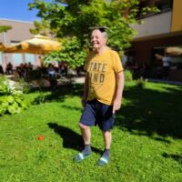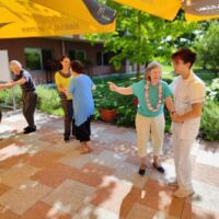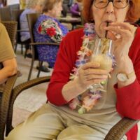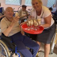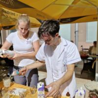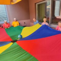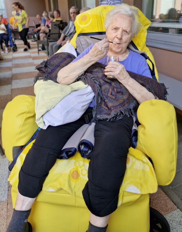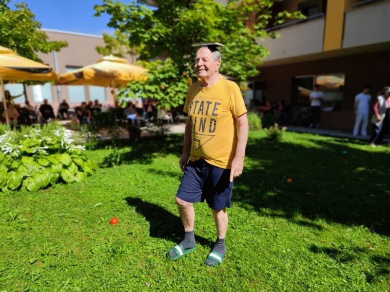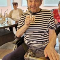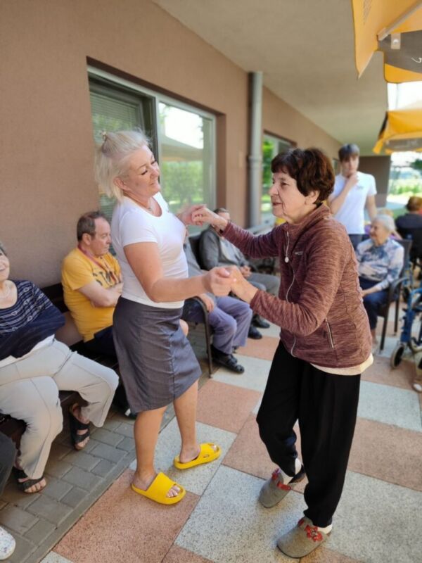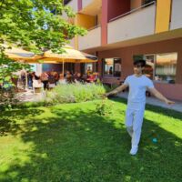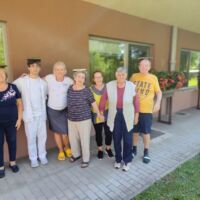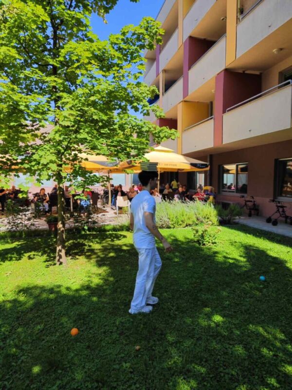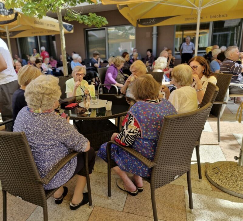V poletnih mesecih se zelo radi nastavljamo soncu, hladimo v senci ali pod klimo, najraje pa se osvežimo s hladnimi pijačami in sladoledom. Našim stanovalcem in stanovalkam zato večkrat postrežemo limonado, sadne napitke (“smoothie”) ali sladoled. Danes pa smo se po jutranji telovadbi na terasi, posladkali še z ledeno kavo. Ob tem smo se zelo zabavali, študenta Matej in Tian sta odlično demonstrirala tekmovanje v premagovanju poligona s knjigami. Zmagal je Matej, ki je z izvrstnim ravnotežjem spretno vijugal po poligonu in med tem na glavi nosil kar 5 knjig. Nato so se v tej zabavni igri preizkusili še stanovalci in stanovalke ter odlično opravili nalogo. Bilo je res prijetno dopoldne.