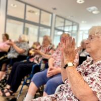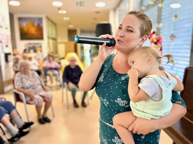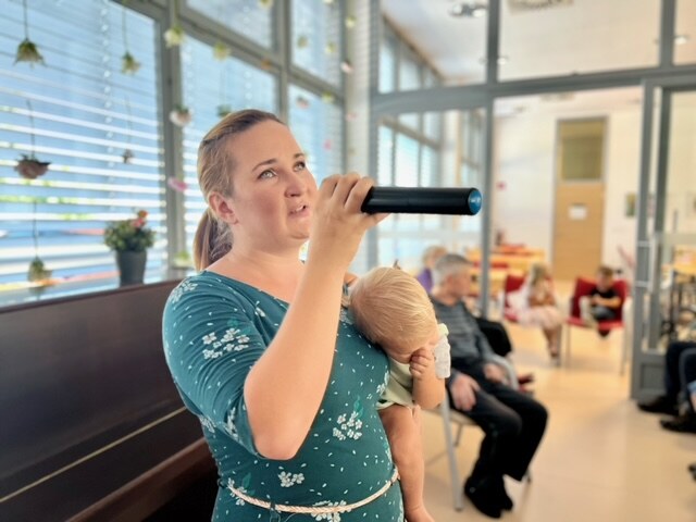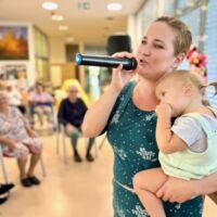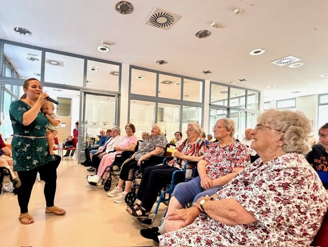 Na lep poletni dan nas je obiskala Urša Mršnik in nas s svojim čarobno žametnim glasom nežno pobožala, tako kot vsakič prej, ko je bila še zaposlena pri nas. Slišali smo kar nekaj lepih slovenskih in hrvaških popevk, poleg smo se zazibali in seveda tudi zapeli. Urša tokrat ni prišla sama. Cel čas nastopa se ji je v naročju namreč stiskala njena najmlajša Nika, najstarejša Kaja nam je zapela krasno pesmico o čebelici, bratec Rok pa je skrbel za varnost. Za njihov prisrčno navihan obisk se vsem lepo zahvaljujemo in upamo, da nas ponovno kmalu obiščejo.