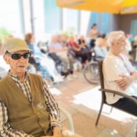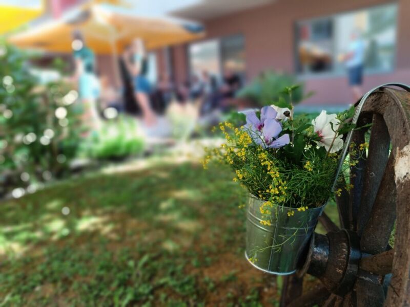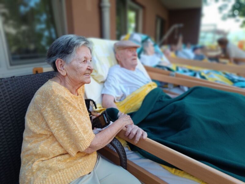 V našem centru imamo nekaj stanovalcev, ki zaradi zdravstvenih omejitev ne morejo sedeti na počivalniku ali invalidskem vozičku. Kljub temu jim želimo omogočiti stik z naravo – pogled na zelenje, toplino sončnih žarkov in svež zrak. Zato se večkrat letno organiziramo in jih kar s posteljami odpeljemo na letno teraso.