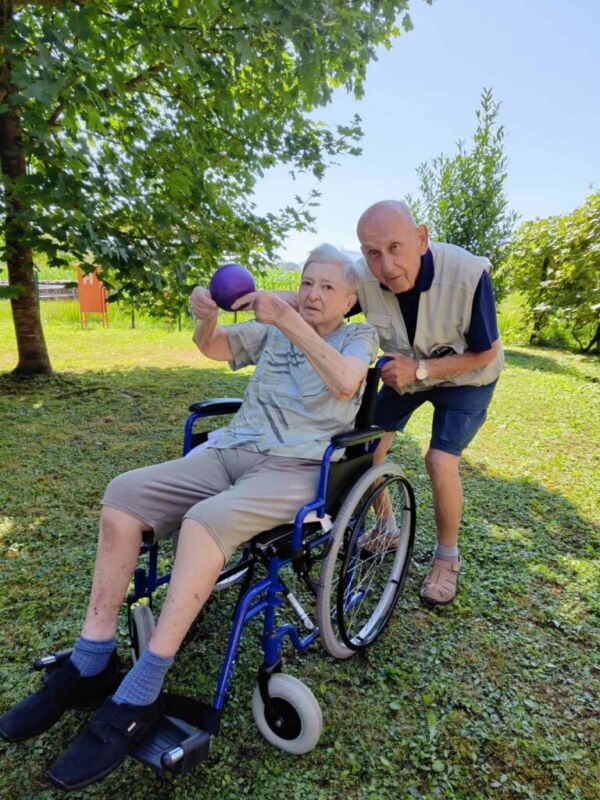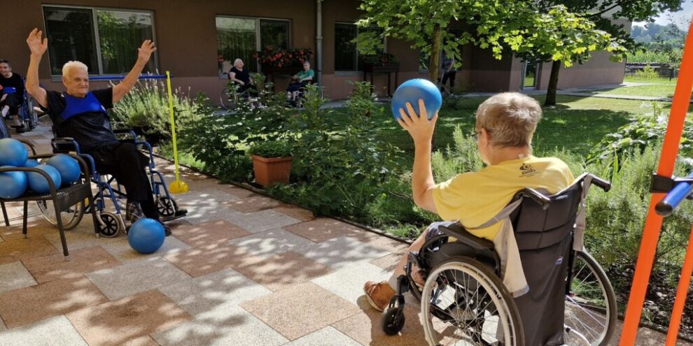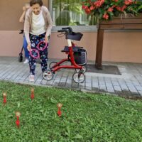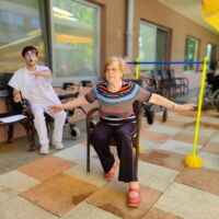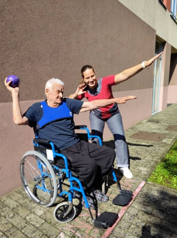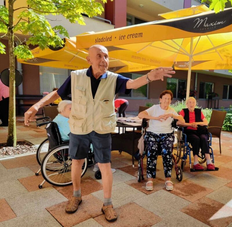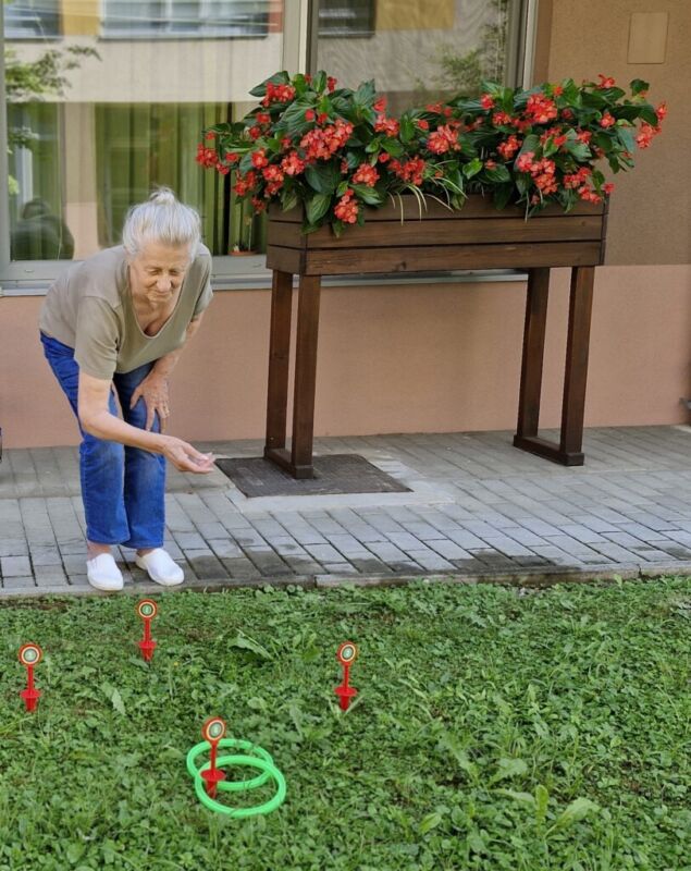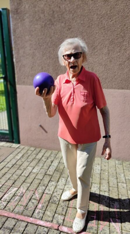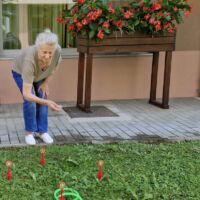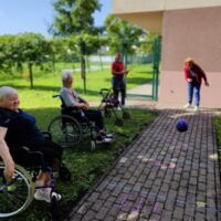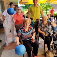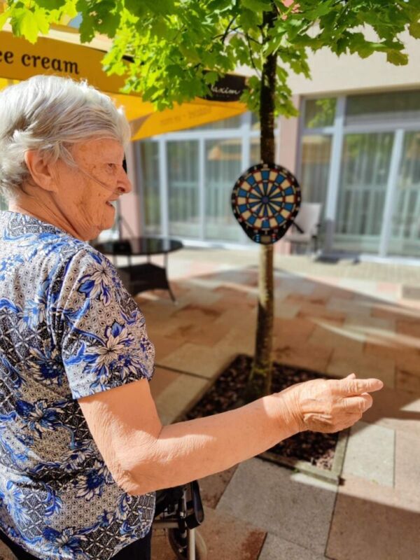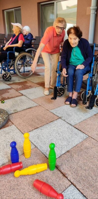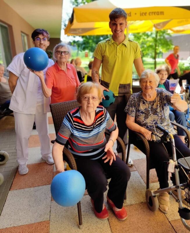 “Šport je igra” in za nami je res prekrasno dopoldne. Stanovalci in stanovalke so se ob prijetnih temperaturah na jutranji telovadbi, dobro pripravili in ogreli za današnje športno družabne aktivnosti. Na naši čudoviti zeleni terasi, smo na več različnih postajah, preizkušali naše motorične sposobnosti in se ob tem neizmerno zabavali. Nekateri od njih so se preizkusili v metu krogle, drugi v pikadu in tretji v rokometu ali kegljanju. Marsikdo od njih ni verjel, da vse to zmore narediti in prav ponosni so bili, ker jim je uspelo. Gospod Recelj je postavil rekord centra v metu krogle, gospod Jugovic je izvrstno ciljal v sredino table s pikado puščicami, gospa Hren in gospa Jazbec pa sta se je neizmerno zabavali, ko sta z našima študentoma fizioterapije, igrali rokomet.