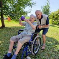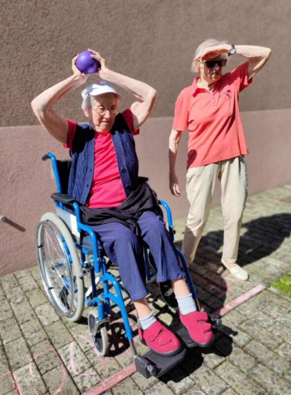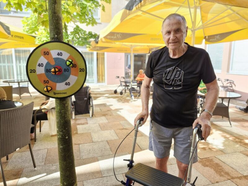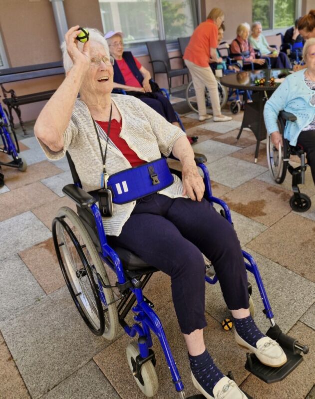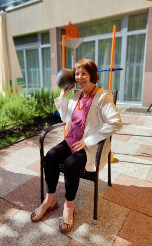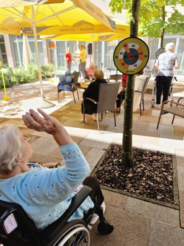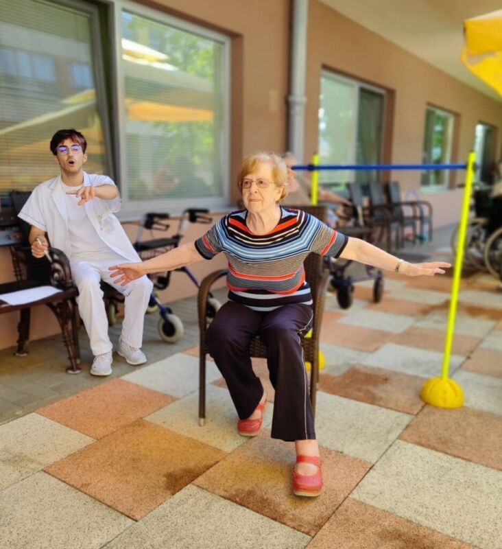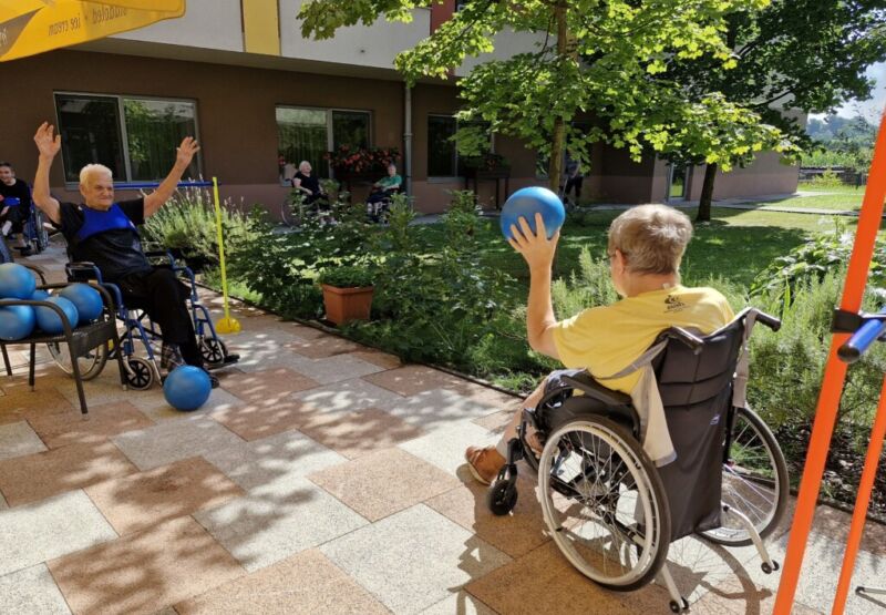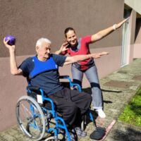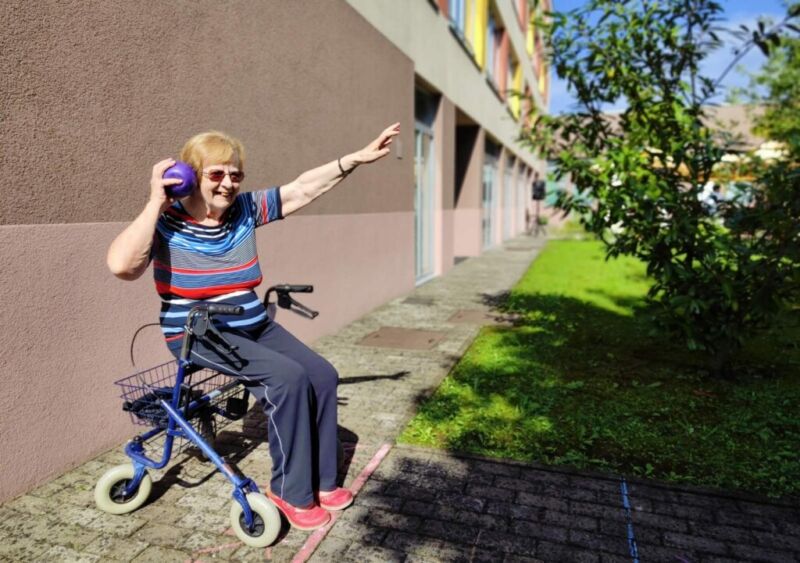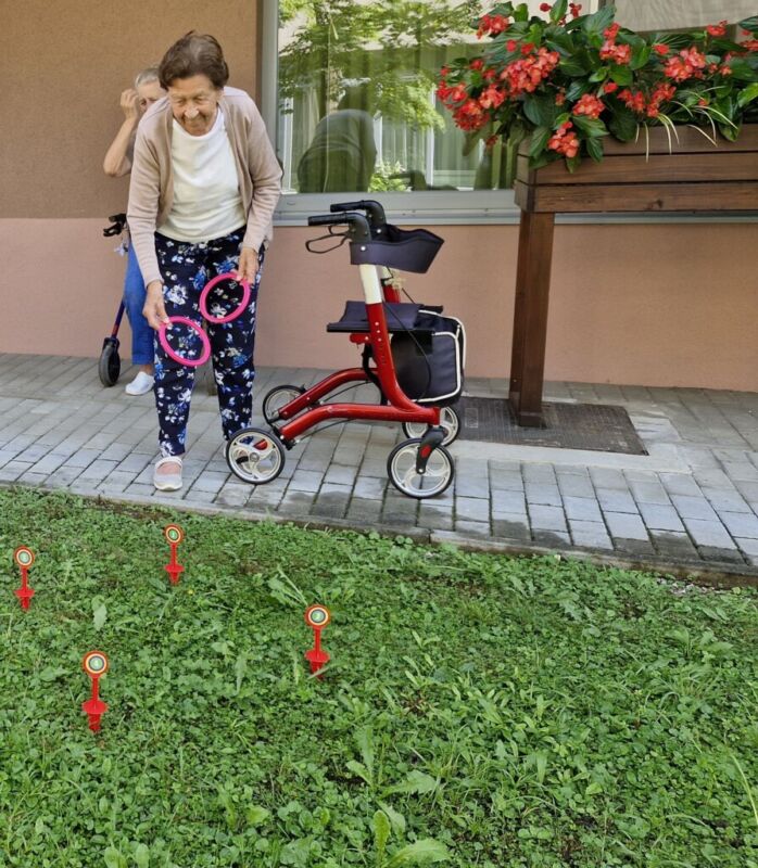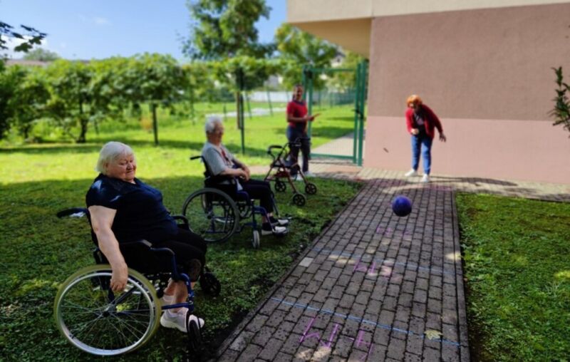 “Šport je igra” in za nami je res prekrasno dopoldne. Stanovalci in stanovalke so se ob prijetnih temperaturah na jutranji telovadbi, dobro pripravili in ogreli za današnje športno družabne aktivnosti. Na naši čudoviti zeleni terasi, smo na več različnih postajah, preizkušali naše motorične sposobnosti in se ob tem neizmerno zabavali. Nekateri od njih so se preizkusili v metu krogle, drugi v pikadu in tretji v rokometu ali kegljanju. Marsikdo od njih ni verjel, da vse to zmore narediti in prav ponosni so bili, ker jim je uspelo. Gospod Recelj je postavil rekord centra v metu krogle, gospod Jugovic je izvrstno ciljal v sredino table s pikado puščicami, gospa Hren in gospa Jazbec pa sta se je neizmerno zabavali, ko sta z našima študentoma fizioterapije, igrali rokomet.