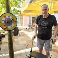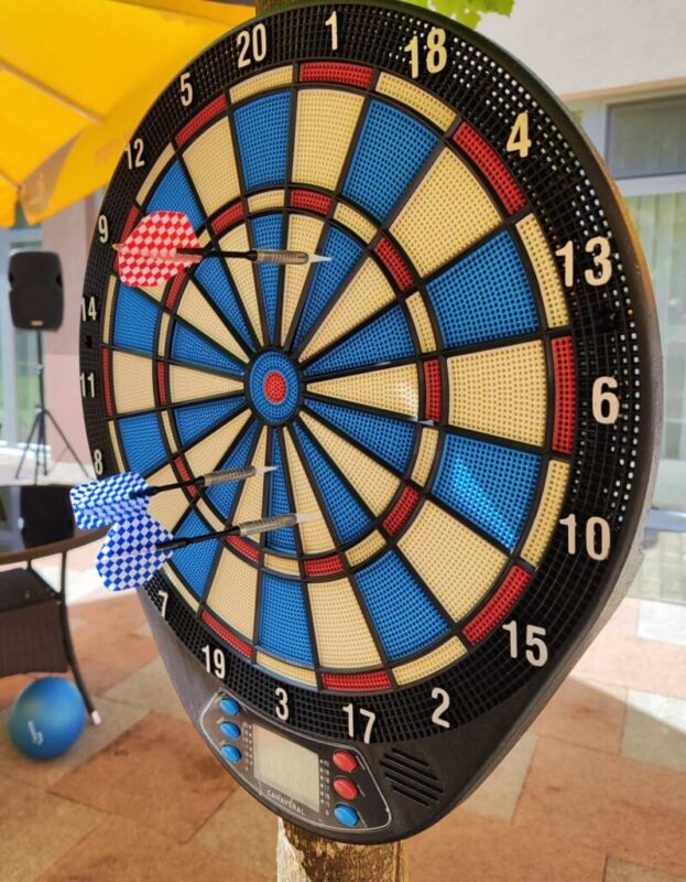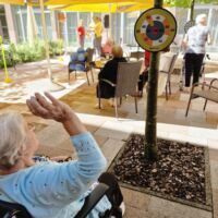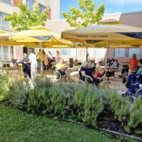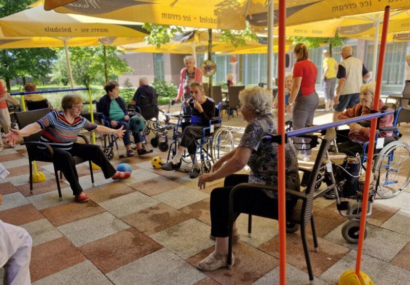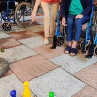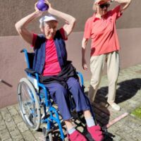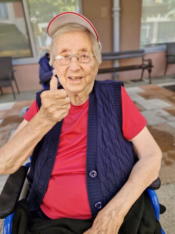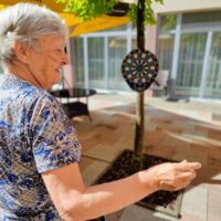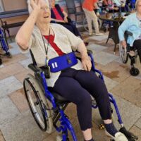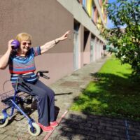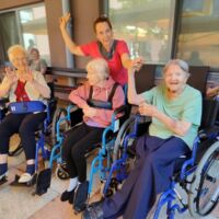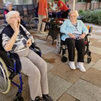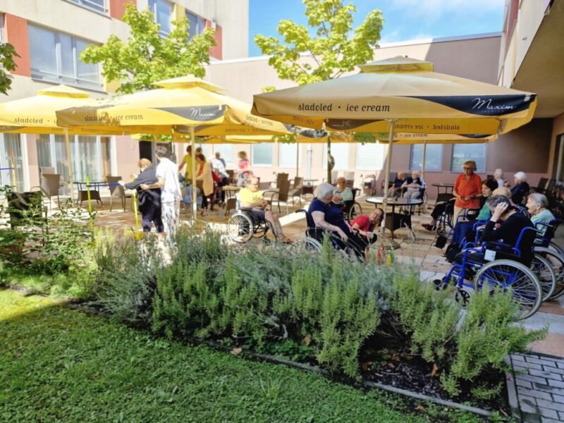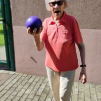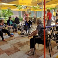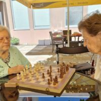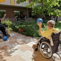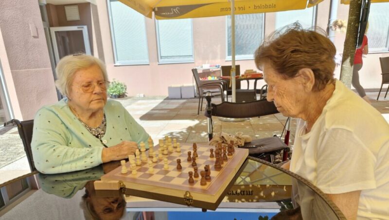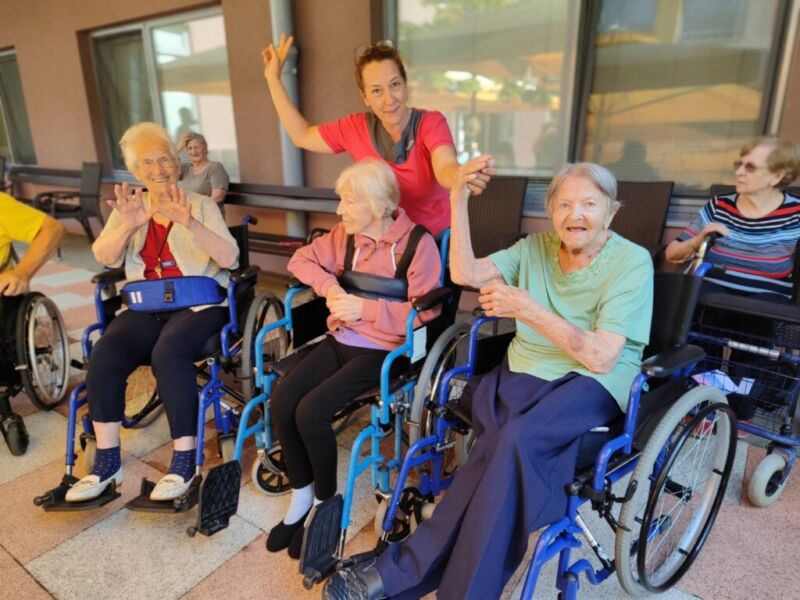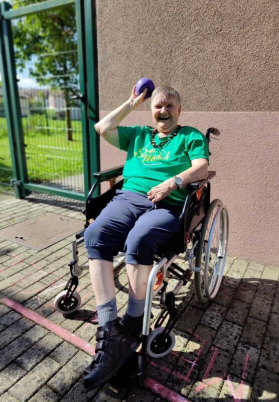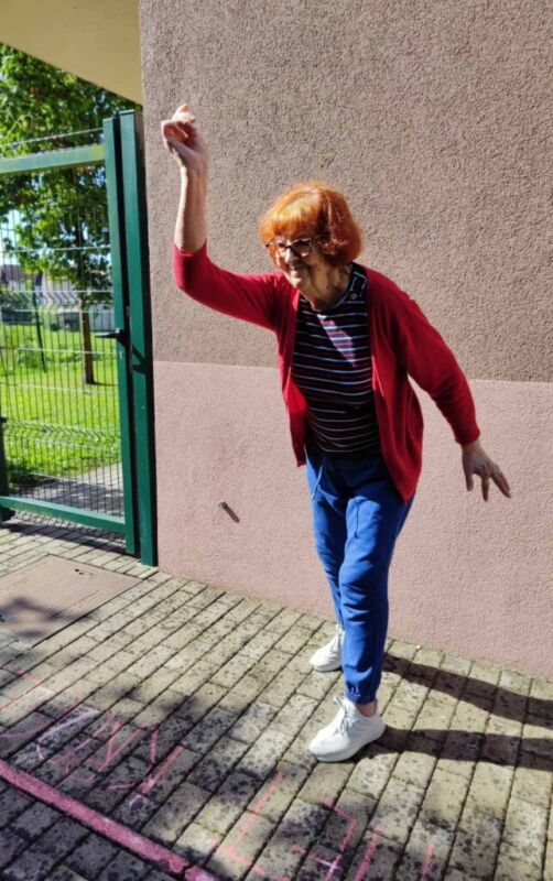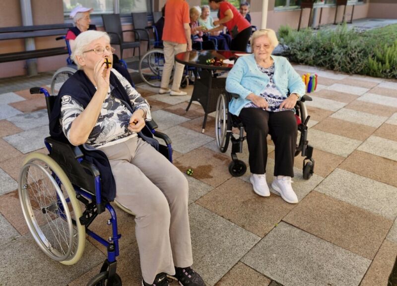 “Šport je igra” in za nami je res prekrasno dopoldne. Stanovalci in stanovalke so se ob prijetnih temperaturah na jutranji telovadbi, dobro pripravili in ogreli za današnje športno družabne aktivnosti. Na naši čudoviti zeleni terasi, smo na več različnih postajah, preizkušali naše motorične sposobnosti in se ob tem neizmerno zabavali. Nekateri od njih so se preizkusili v metu krogle, drugi v pikadu in tretji v rokometu ali kegljanju. Marsikdo od njih ni verjel, da vse to zmore narediti in prav ponosni so bili, ker jim je uspelo. Gospod Recelj je postavil rekord centra v metu krogle, gospod Jugovic je izvrstno ciljal v sredino table s pikado puščicami, gospa Hren in gospa Jazbec pa sta se je neizmerno zabavali, ko sta z našima študentoma fizioterapije, igrali rokomet.