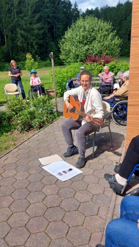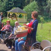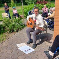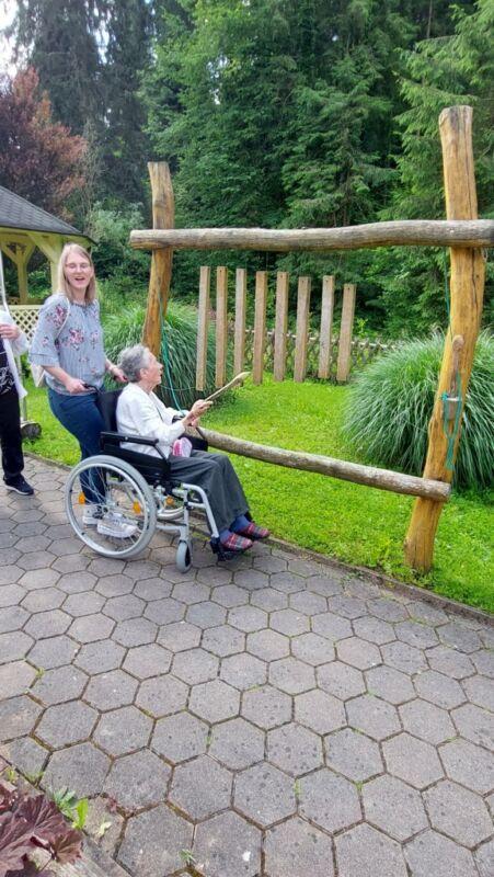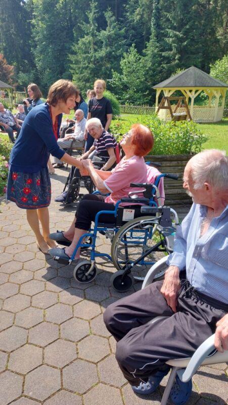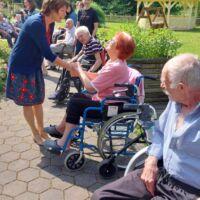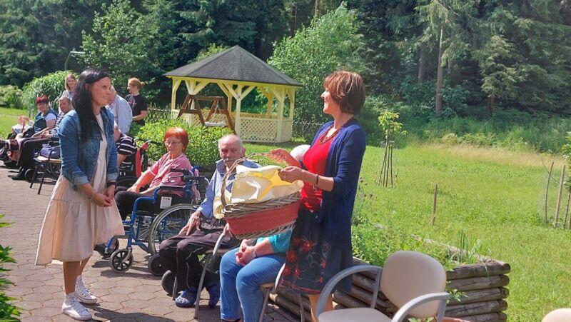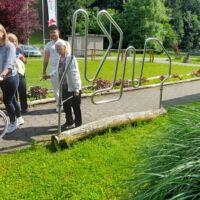 Danes so se nam v parku pred centrom pridružili stanovalci Doma za varstvo odraslih Velenje, ki so trenutno naši začasni sosedje, saj bivajo v sosednjih termah. V Velenju namreč zanje gradijo nov dom. Ker imamo pred našim centrom veliko prostora, zelenja in senčnic, smo jih povabili, da skupaj preživimo nekaj časa. Pozdravila jih je direktorica Andreja Štefan Bukovič, stanovalci Zimzelena pa so jim za dobrodošlico zapeli par pesmi. Sosednje so se preizkusili v igranju ruskega kegljanja, se sprehodili čez senzorno pot, preizkusili svoje veščine na orodju mirna roka in zaigrali na leseni ksilofon. Veliko naših in velenjskih stanovalcev se pozna in tako so po dolgih letih prijetno poklepetali.