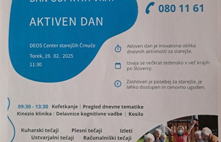 z veseljem vas vabimo na Dan odprtih vrat – Aktiven dan v Centru starejših Črnuče, ki bo potekal v torek, 19. februarja 2025, od 11:30 do 13.30.